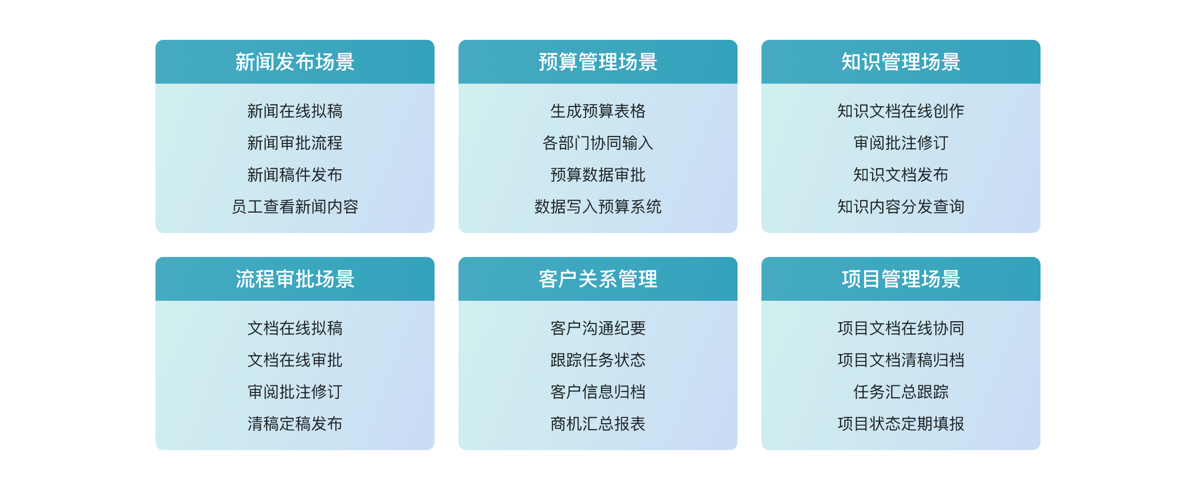 赋予OA平台⽂档在线协同能⼒,升级各类业务场景的⽤户体验,强化内容安全,降低信息泄露⻛险,将OA平台功能提升⾄新⾼度